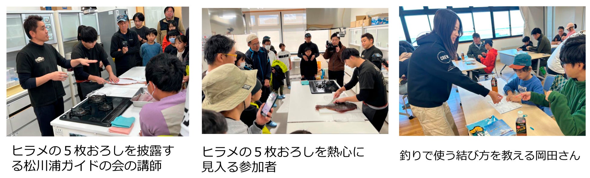 【料理教室&結び方教室】トークショーの後は、相馬双葉漁協に移動し、「常磐もの」のヒラメをさばいて味わう料理教室と釣りで使う結び方教室が開かれた。料理教室の講師を務めたのは、地元の旅館の若旦那で組織する「松川浦ガイドの会」の丸三旅館、菅野雄三さんと亀谷旅館、久田浩之さん。見事な包丁さばきで、ヒラメの5枚おろしを披露した。菅野さんは「常磐もののヒラメは、肉厚で旨味が濃い。刺し身だけでなく、フライにしてもとてもおいしい」と、アドバイス。参加者はヒラメの刺し身を味わった。結び方教室ではナビゲーターの岡田さんの指導で、糸と糸をつなぐサージェンスノットなどに挑戦した。