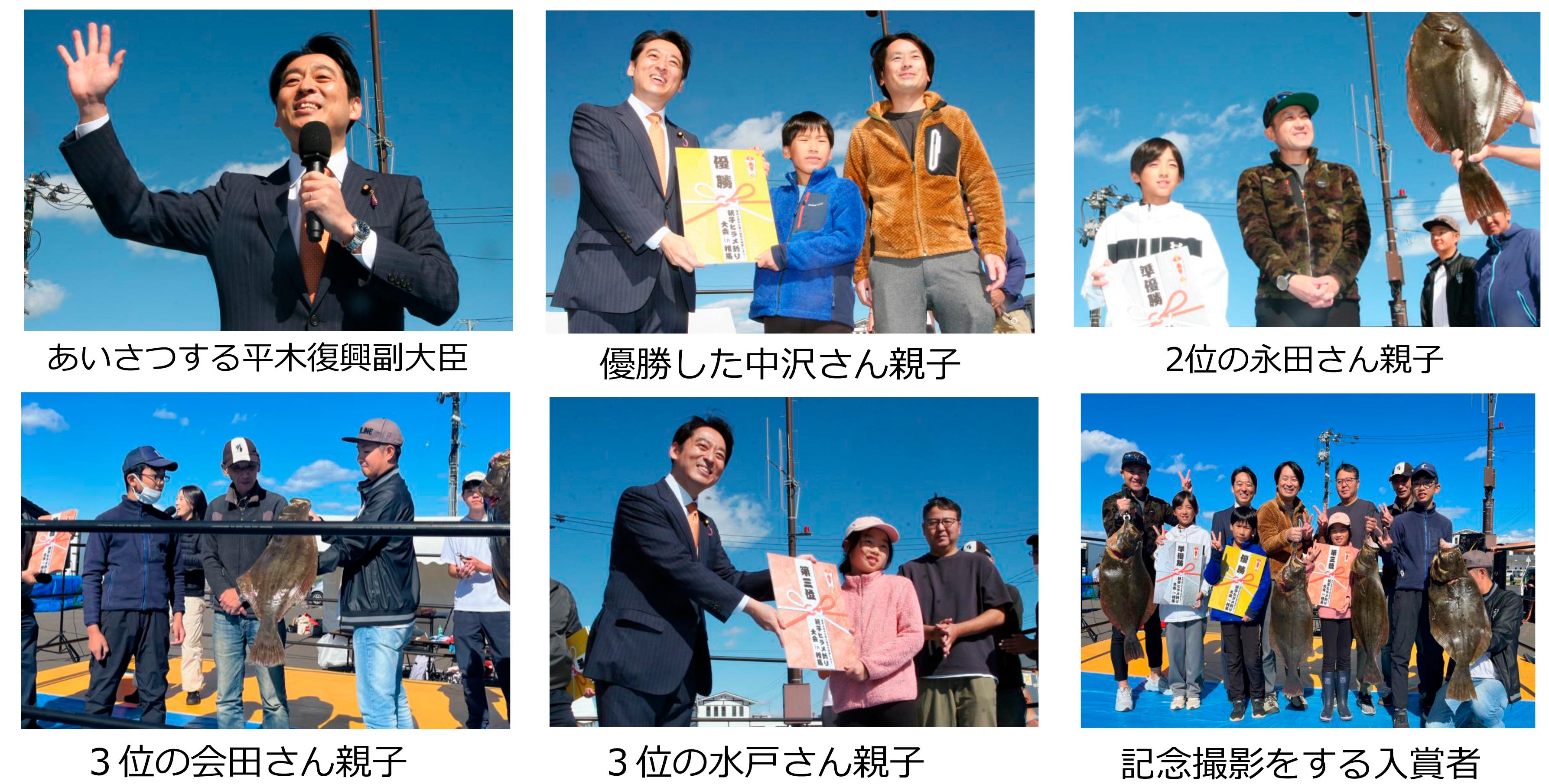 【表彰式】大会の表彰式は、地元の相馬復興市民市場「浜の駅松川浦」で開催された3周年感謝祭イベントのプロレスのリングをステージにして行われた。まず主催者を代表して平木大作復興副大臣が「参加した全家族が釣り上げることができて、福島の海の豊かさを実感していただけたと思う。この経験を友人や家族など周りの人たちに伝えてほしい。釣りや食体験を通じて福島のファンを増やし、福島を訪れてもらい、リピーターになってもらうことが復興につながる」と、あいさつ。平木副大臣から入賞者に福島の産品などが選べるカタログギフトの賞品目録ボードが贈呈された。東京都豊島区から参加し、91センチの大物を釣り上げ優勝した会社員、大沢和正さん(41)は「初めての海釣りでこんなに大きなヒラメが釣れて驚いている。福島の海の豊かさを実感できた」と話し、千里君は「重くて大きくてビックリした。優勝できてうれしい」と笑顔をみせた。
