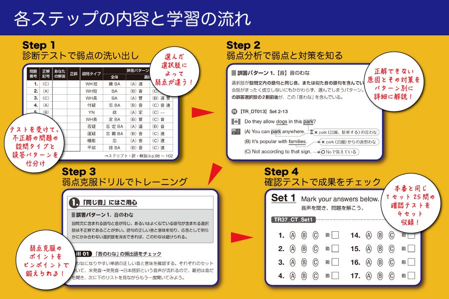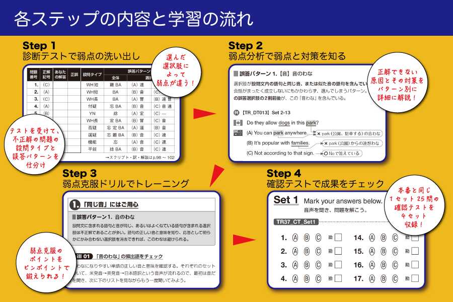 誤答パターンごとに必要なスキルを補うトレーニングを提供。仕上げの確認テスト(25問×4セット)で「正解できる耳」への成長を実感できます。