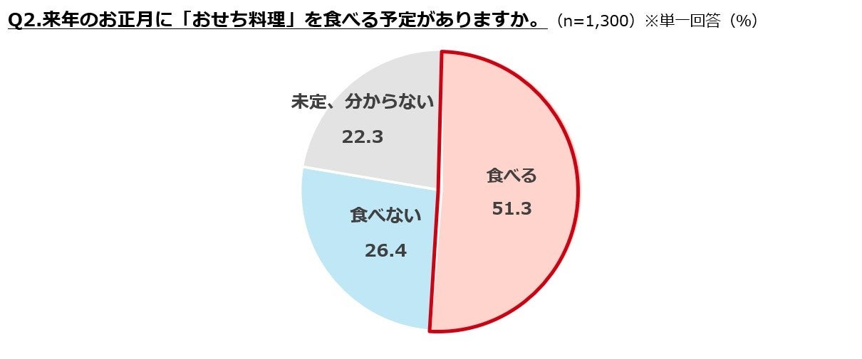 また、おせち料理を「食べる予定がある」人は全体で51.3%と約半数にとどまりました。実は、資料には載せていませんが、20代、30代では全体と比べて低い傾向が見られていました。20代、30代の若者を中心に、お正月の食卓の多様化が進んでいるのかもしれません。