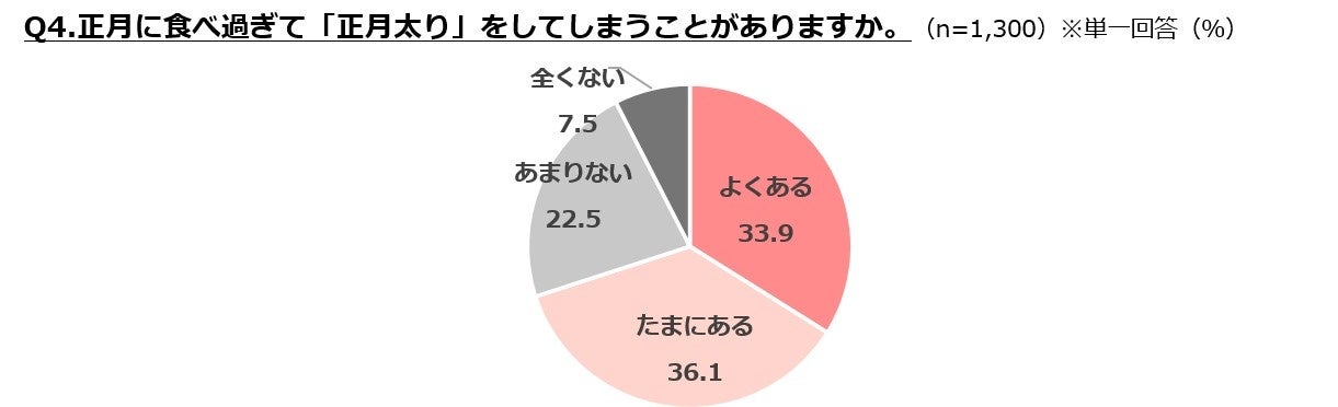 正月太りを「よくある」(33.9%)、「たまにある」(36.1%)と回答した人が合わせて7割を超えており、多くの人が連休中の食べ過ぎを経験。