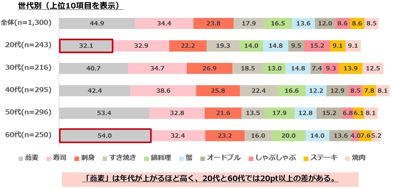 ・大晦日に食べるものは、「蕎麦」「寿司」「刺身」がTOP3。「蕎麦」は年代が上がるほど高く、20代と60代では20pt以上の差がある。