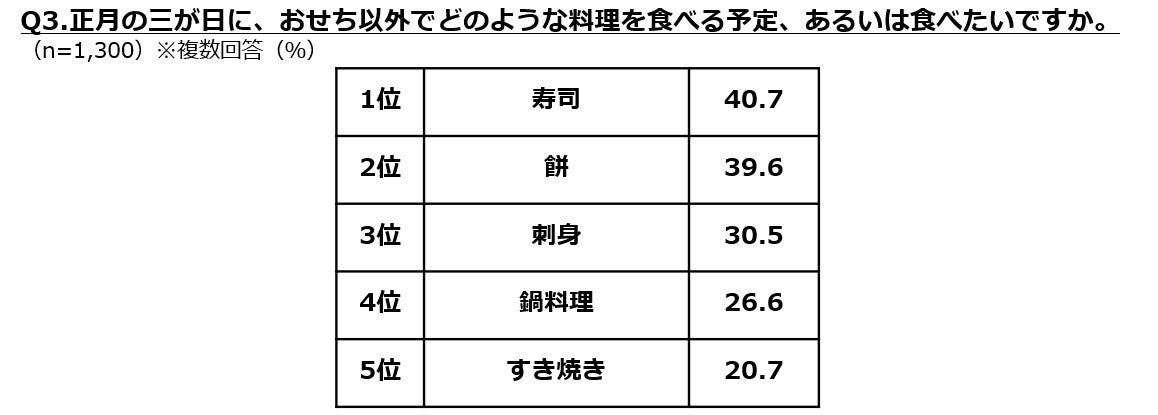 正月三が日のメニューでは、「寿司」、「餅」、「刺身」が上位です。