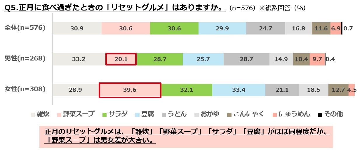 ・正月のリセットグルメは、「雑炊」「野菜スープ」「サラダ」「豆腐」がほぼ同程度だが、「野菜スープ」は男女差が大きい。
