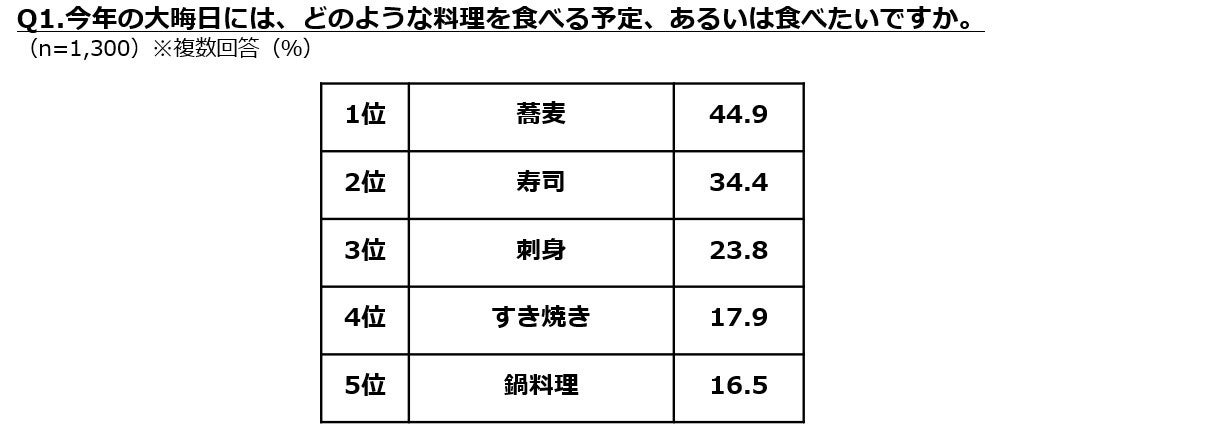 今回の調査では、年末年始の「食」の過ごし方について、性別や年代による傾向の違いが鮮明になりました。大晦日のメニューでは、「蕎麦」、「寿司」、「刺身」がトップ3を占め、年越し蕎麦を中心とする伝統が根強いことがわかります。特に「蕎麦」は、20代(32.1%)と60代(54.0%)で20ポイント以上の差があり、高齢層ほど伝統を重んじる傾向が明確です。