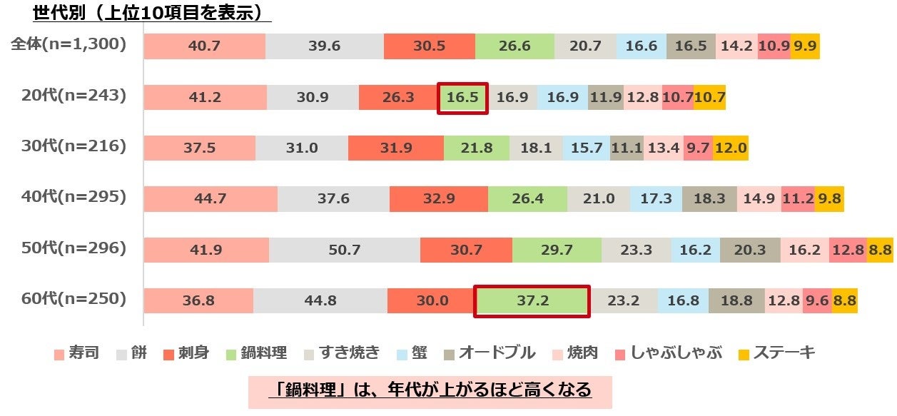 ・正月に食べるものは、「寿司」「餅」「刺身」がTOP3。4位の「鍋料理」は、年代が上がるほど高くなる。