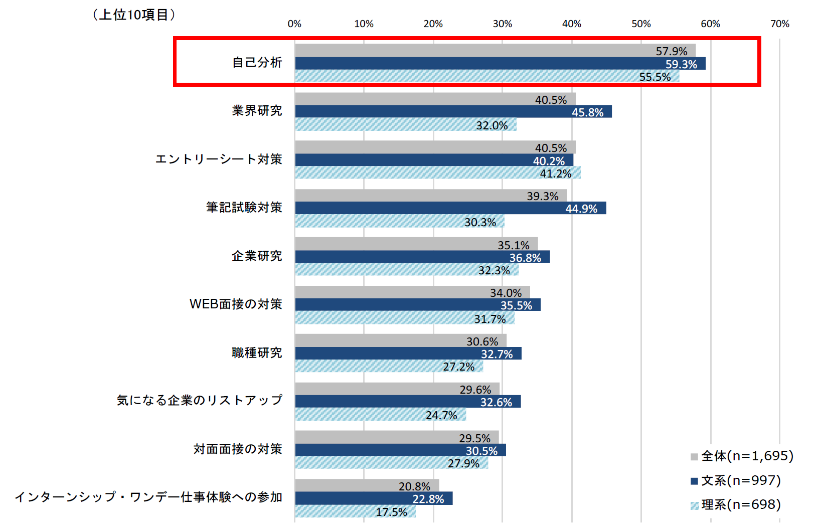 2023年3月卒業見込みの全国の大学3年生、大学院1年生が、「年内にやっておけばよかった、もっと時間をかければよかった」と思う就活準備は「自己分析」が最多で57.9%だった。就職活動準備というと、エントリーシート対策や面接対策などの選考準備のイメージが強いが、それだけでなく、“まず自分を知ることが大切である”と考えているようだ。また、文系学生では「業界研究」が45.8%と理系学生よりも13.8pt高かった。学業と職業が連携しづらい文系学生にとって、就職活動準備期間で、自分の志望業界を明確にしていくことが重要となっているようだ。【図1】