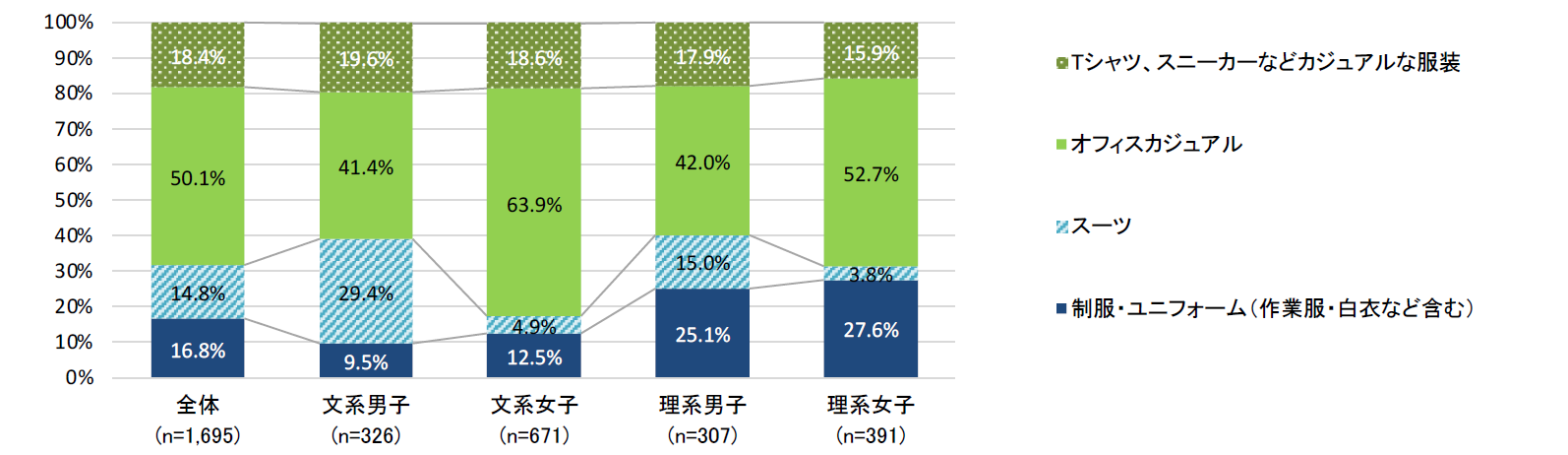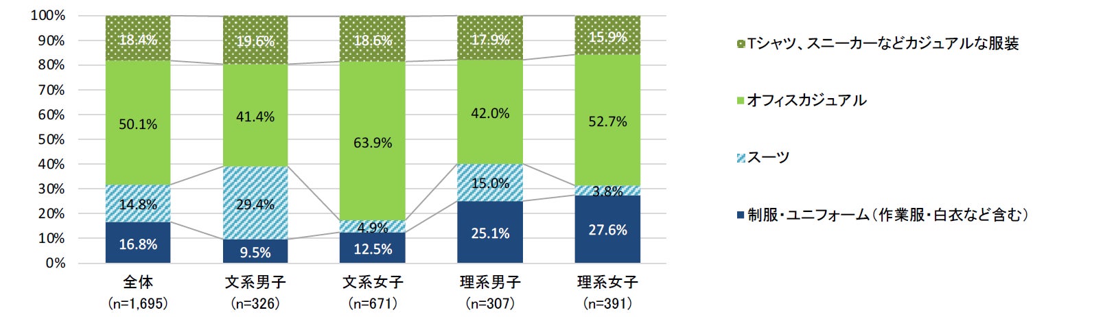 - 働くときの服装について文理問わず人気なのは「オフィスカジュアル」、服装が入社意欲に影響する割合は3割程度【図5、6】