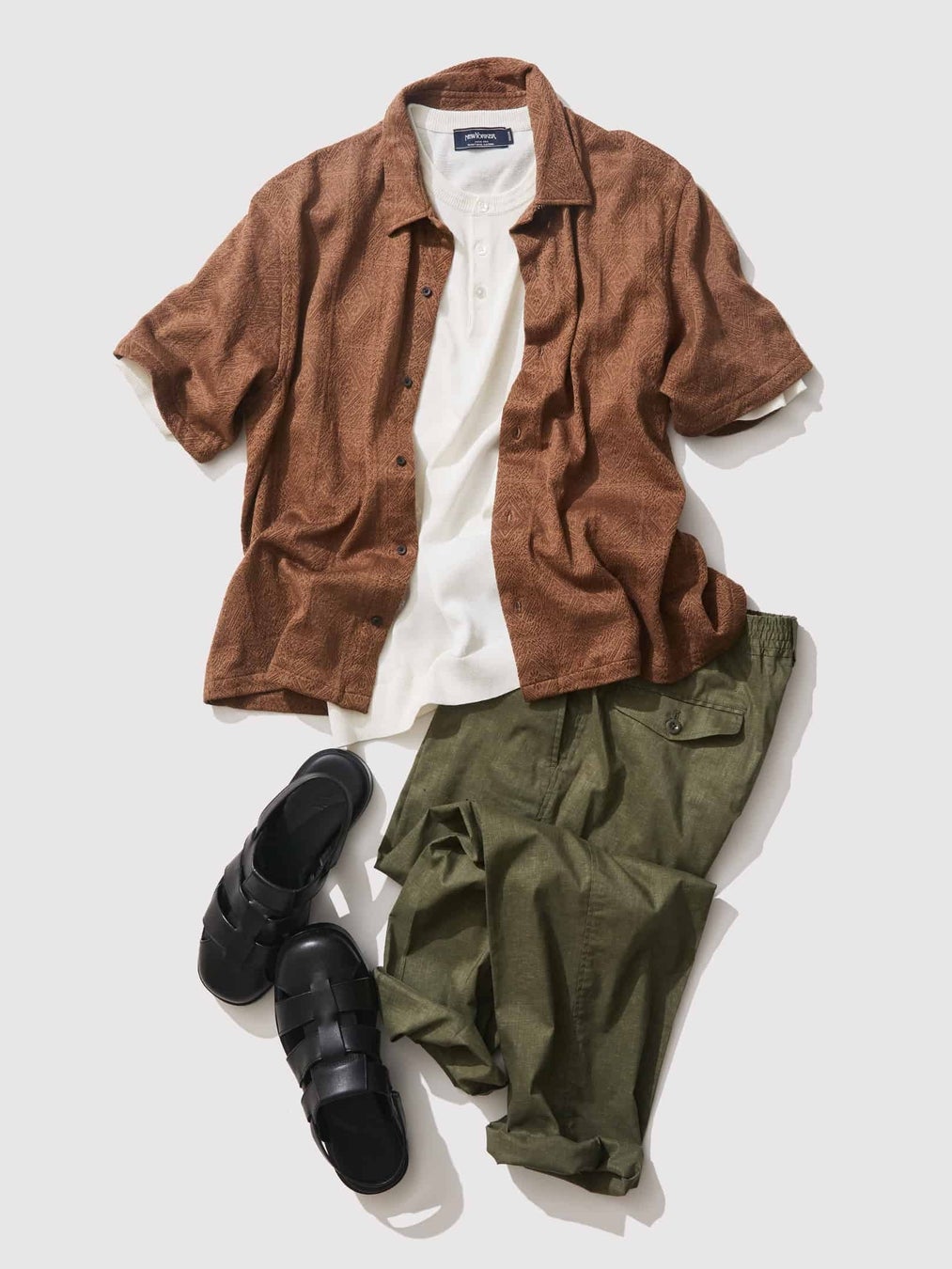 上品なシアー感と、立体感あるジャガード織りが軽やかな着心地でありながらラフになりすぎず、大人のカジュアルスタイルを程よく引き締めます。