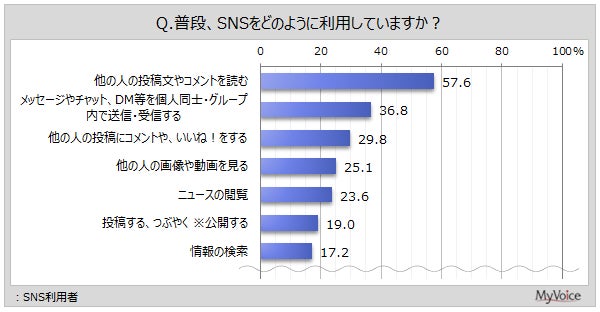SNS利用者に、ふだんSNSをどのように利用しているかを聞いたところ(複数回答)、「他の人の投稿文やコメントを読む」が57.6%、「メッセージやチャット、DM等を個人同士・グループ内で送信・受信する」が36.8%、「他の人の投稿にコメントや、いいね!をする」「他の人の画像や動画を見る」「ニュースの閲覧」が各20%台となっています。