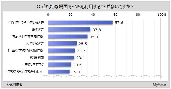 SNS利用者がSNSを利用する場面は(複数回答)、「自宅でくつろいでいるとき」が57.6%、「暇なとき」が37.8%、「ちょっとしたすきま時間」が35.3%です。