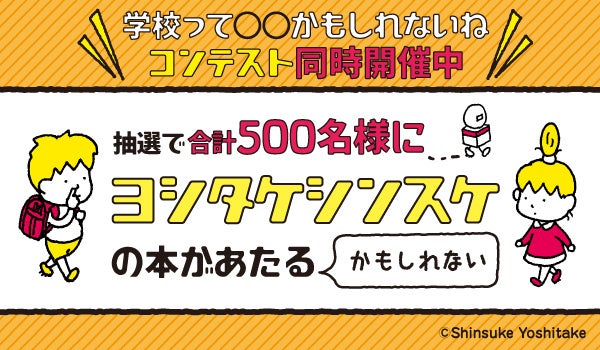 また、SNSから投稿してご参加頂く特別企画も同時に開催中です。キャンペーンのサイトからダウンロードした用紙に「学校って○○かもしれないね」というお題に対するメッセージを書いて撮影。応募規約に沿ってインスタグラムやX(旧ツイッター)に投稿してください。入賞された方には、全12冊セットやヨシタケさんのサイン入り豪華図録を差し上げます。 いずれも、詳しくはキャンペーンサイトをご覧下さい。