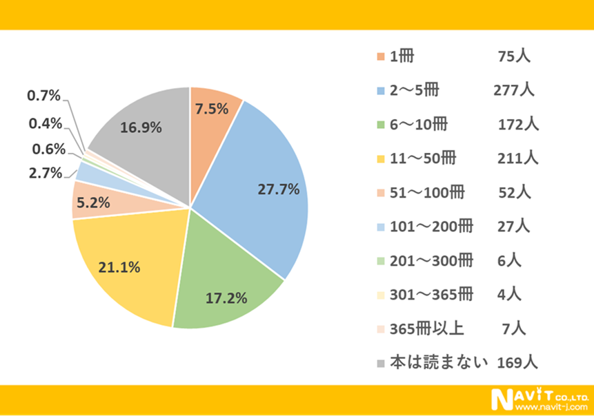 「年間何冊の本を読みますか?」という質問については、「2~5冊」が27.7%、「11~50冊」が21.1%、「6~10冊」が17.2%という順になりました。