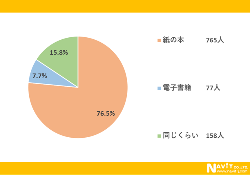 「紙の本と電子書籍どちらが好きですか?」という質問については、「紙の本」が76.5%、「電子書籍」が7.7%、「同じくらい」が15.8%という結果になりました。電子書籍はいつでもどこでも読めて便利ですが、紙の本ならではの良さもありますよね。