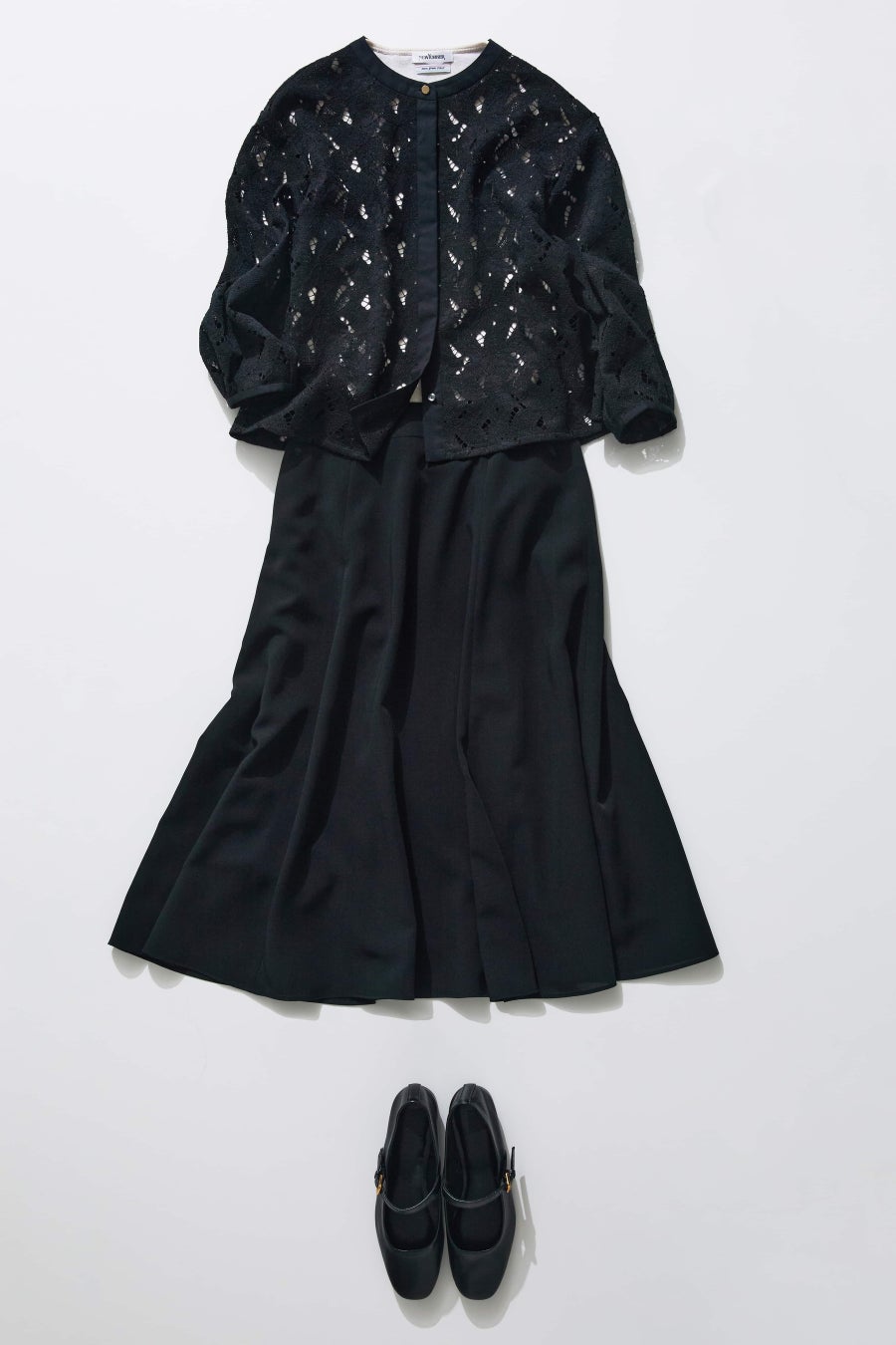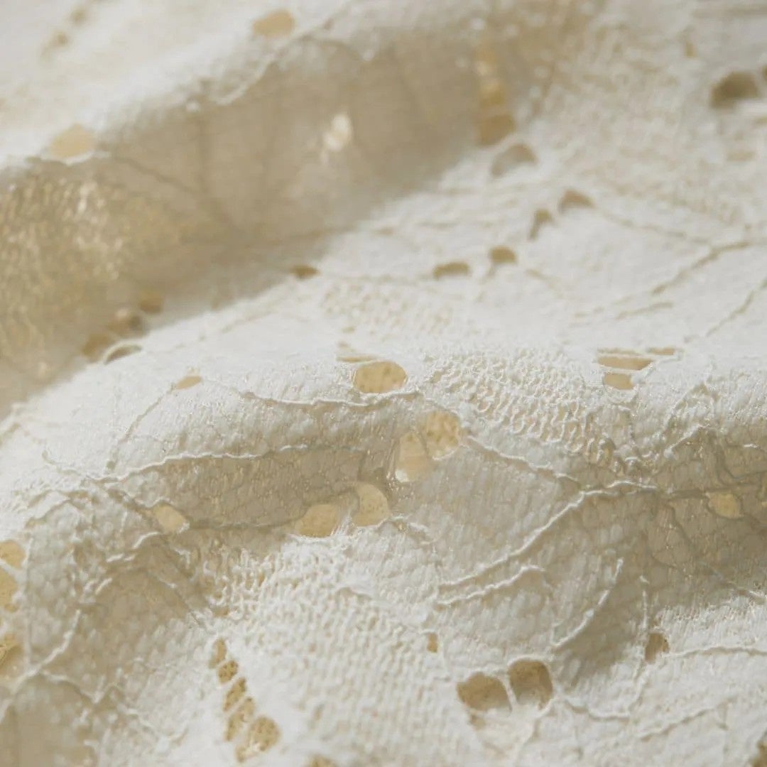 ブラックのスタイルにさらりと羽織り、シックにまとめて。ベージュのラメニットを差し込むことで、奥行きとさりげない華やぎをプラス。透け感のあるレースが軽さを添え、シーンにふさわしい上品さを演出。