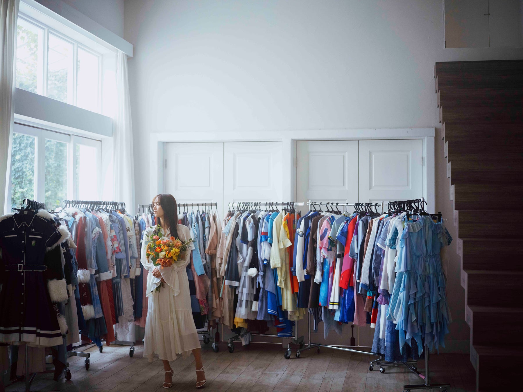 日向坂46キャプテンでもある佐々木久美さんの1st写真集『めくる日々』(3月25日発売/DONUTS)より、先行カット第10弾として、歴代の衣装をバックに卒業を感じさせる白のワンピースと花束を持ったカットを公開しました。窓から降り注ぐ柔らかな陽の光が、儚くも希望に満ちた旅立ちを感じさせます。