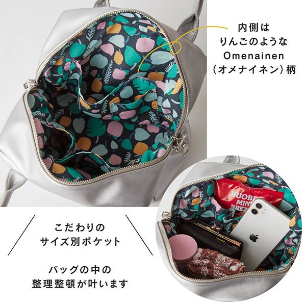 内生地には、テキスタイルデザイナー サンナ・マンデルさんがデザインした花柄の「Blumsteri」をプリント。荷物を出し入れするたびに気分が上がるような、大人かわいいデザインです。