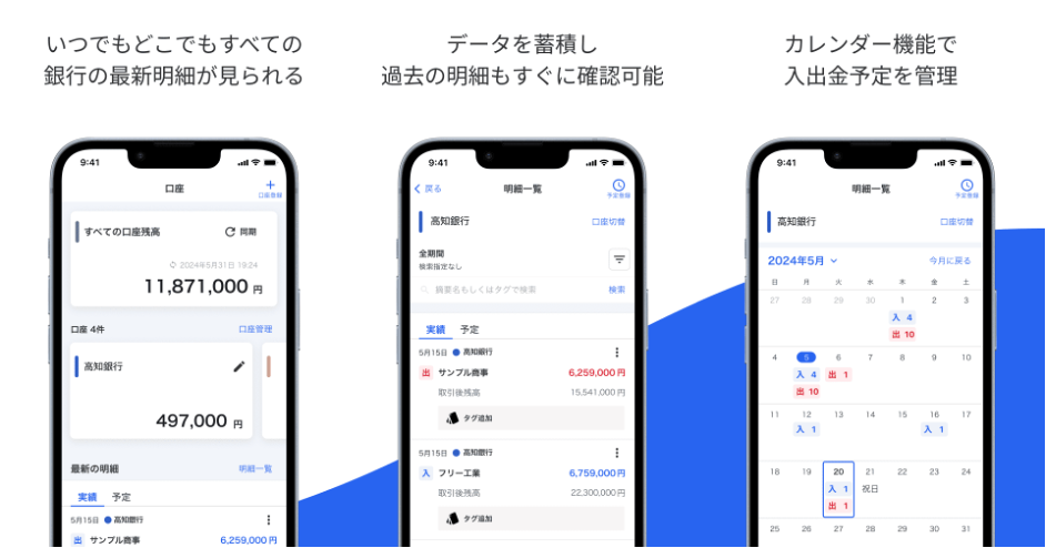 「freee入出金管理」は、他行を含めた複数の事業用口座の残高や入出金明細を一元管理できるサービスです。