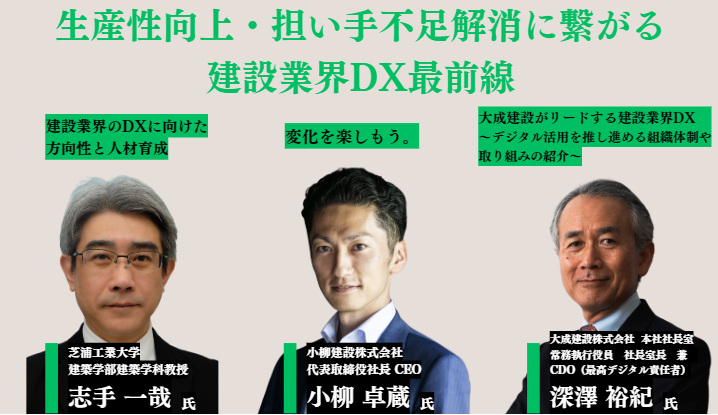 このほか大成建設最高デジタル責任者である深澤裕紀氏が、大規模組織のDXを推進するために必要な組織体制やマインドセットの変革について説明します。