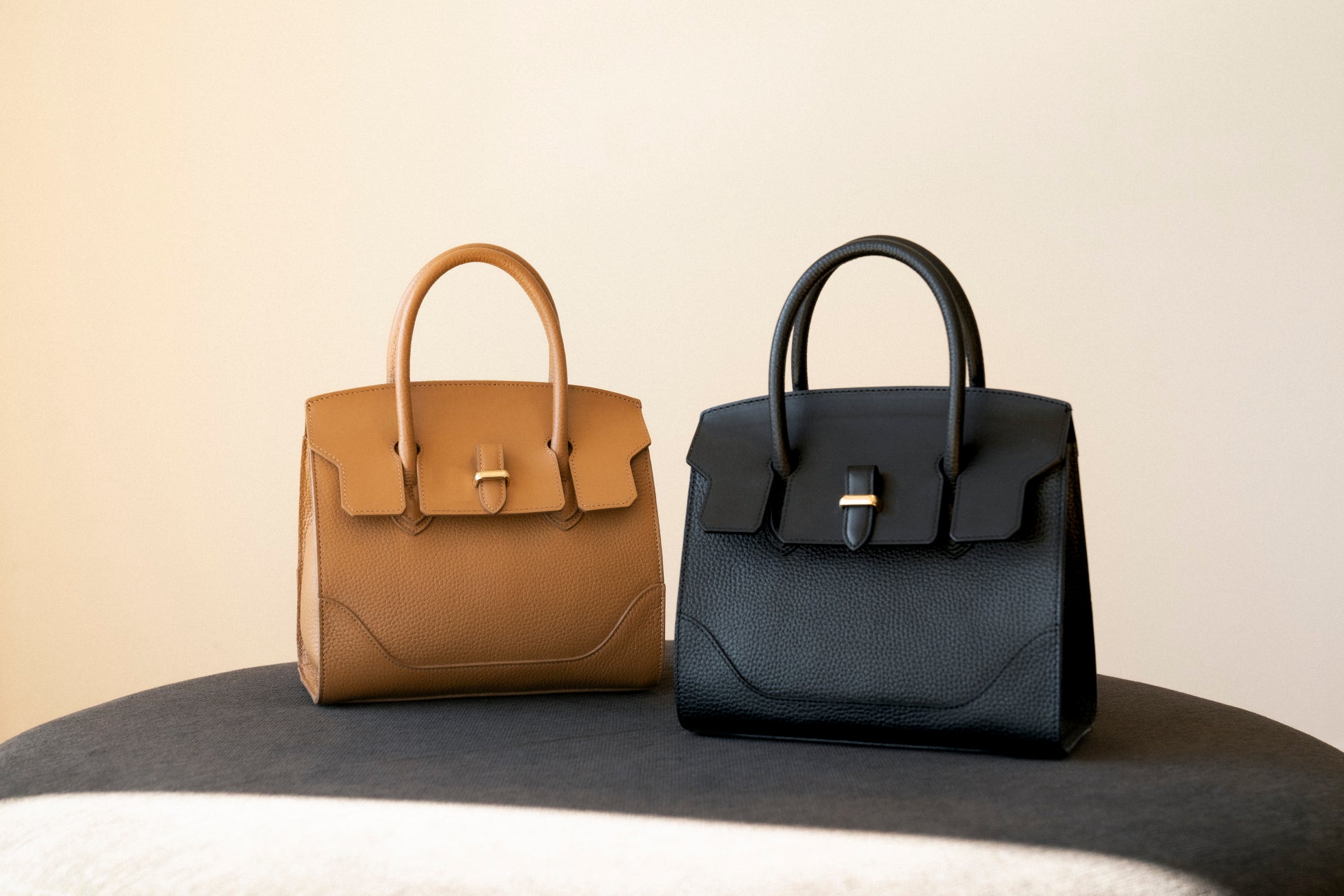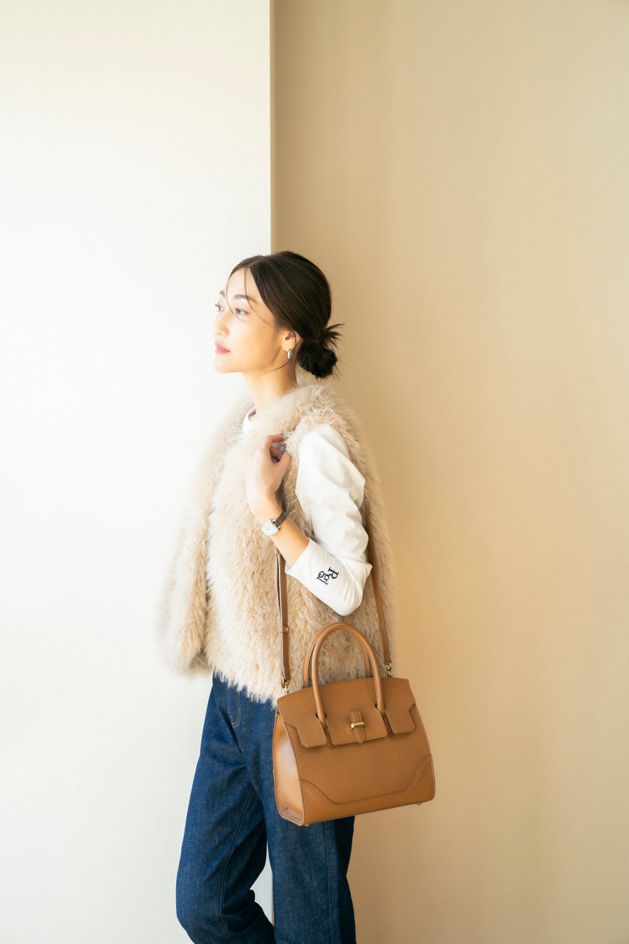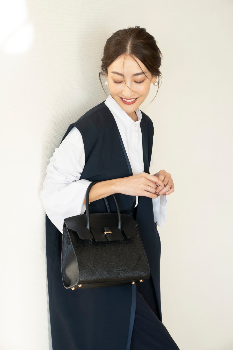 ミニボストンバッグはフラップデザインが特徴的なデザイン。フラップ部分には上品なスムースレザーを、メイン部分はシュリンク型押しレザーを用いることで、同色で落ち着いた印象ながらも遊び心の効いたデザインとなっております。またショルダーベルトも付属し、ハンドバッグとしてもショルダーバッグとしても活躍。カラーはブラックとキャメルの2色展開で、オケージョンシーンからカジュアルシーンまで幅広いご用途にご使用いただけます。