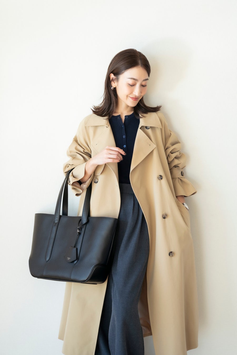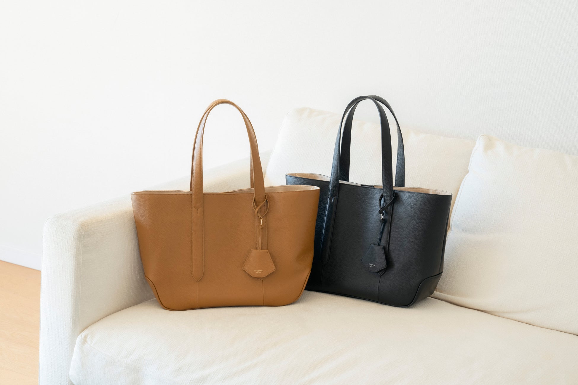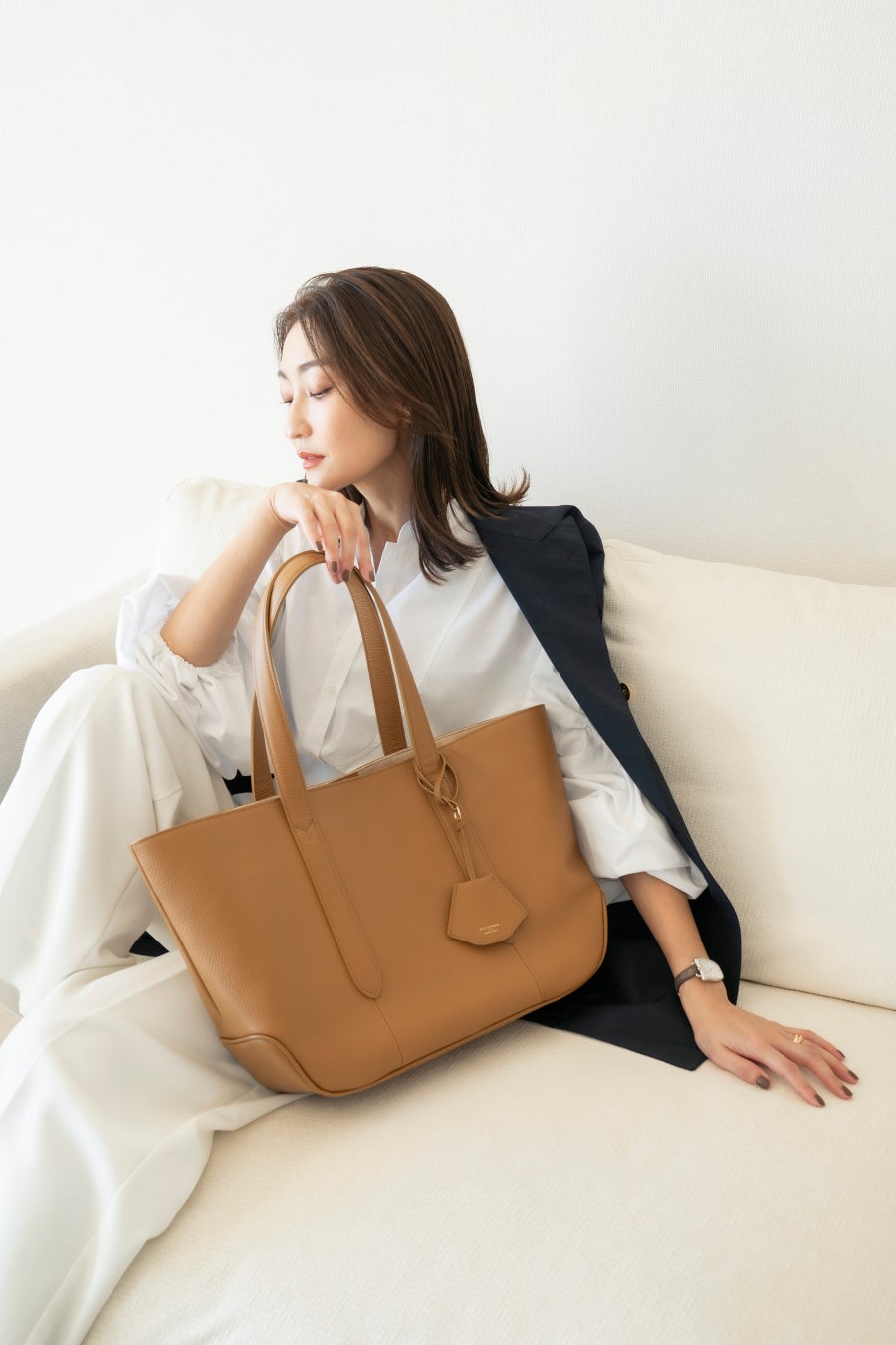 トートバッグはオープンタイプでざっくりと物の出し入れができる仕様。レザーはシュリンク風の型押しレザーを用いており、柔らかな仕上がりです。またバッグに付属したチャームもデザインのポイント。キーリングになっており、実用性も兼ね備えています。こちらもカラーはブラックとキャメルの2色展開で、ビジネスシーンや手荷物などが多い方におすすめです。
