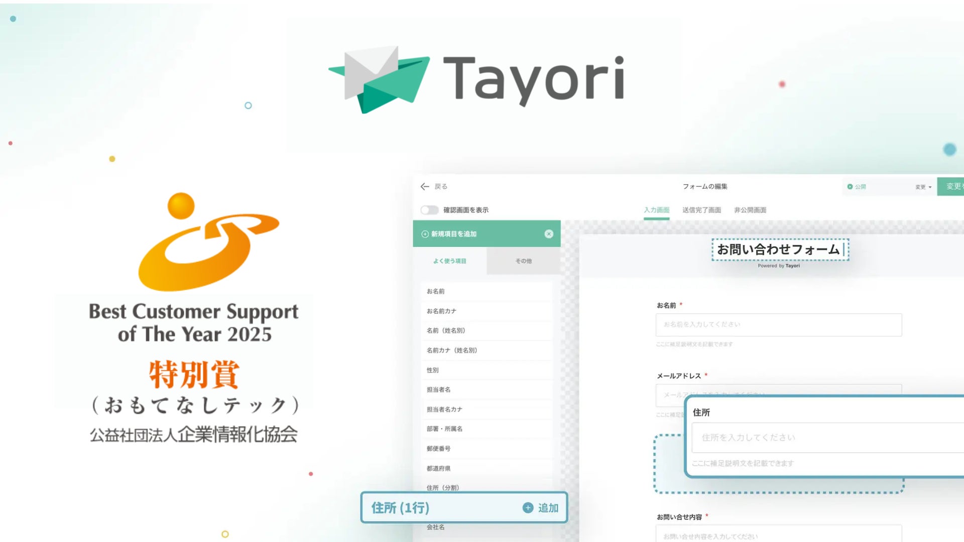 株式会社PR TIMES(東京都港区、代表取締役:山口拓己、東証プライム:3922、以下:PR TIMES)は、運営するカスタマーサポートツール「Tayori」(読み:タヨリ)が、2025年7月7日(月)に公益社団法人企業情報化協会が発表した『カスタマーサポート表彰制度2025年』において、特別賞「おもてなしテック」を受賞いたしました。