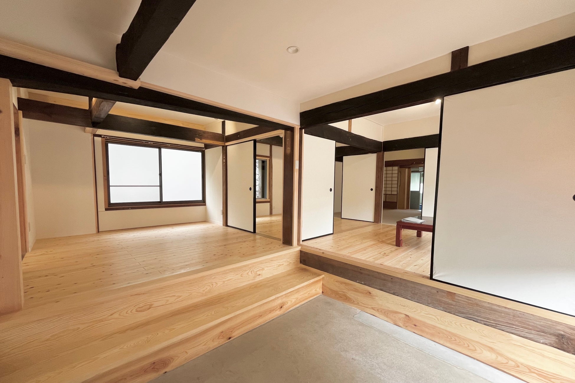 リノベーションを行った物件は、移住・定住の促進のため、空き家を整備して希望者に賃貸する住宅(中間管理住宅)です。当社は、リノベーションの設計及びインテリアコーディネートを担当しました。母屋には、移住や定住を希望される方に入居いただき、離れは、入居者が宿泊施設として貸出できるようにすることで、移住や定住希望者が稼ぎながら暮らせる仕組みを整えています。両棟ともにプライベートを確保できる空間を保ちつつ、入居者と宿泊者が交流できるスペースを母屋に設けています。