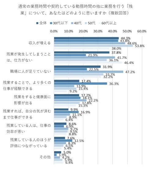 「残業=人員不足」と考える40代が約半数、30代以下では「残業が経験に繋がる」との回答が他の年代の倍以上集まる
