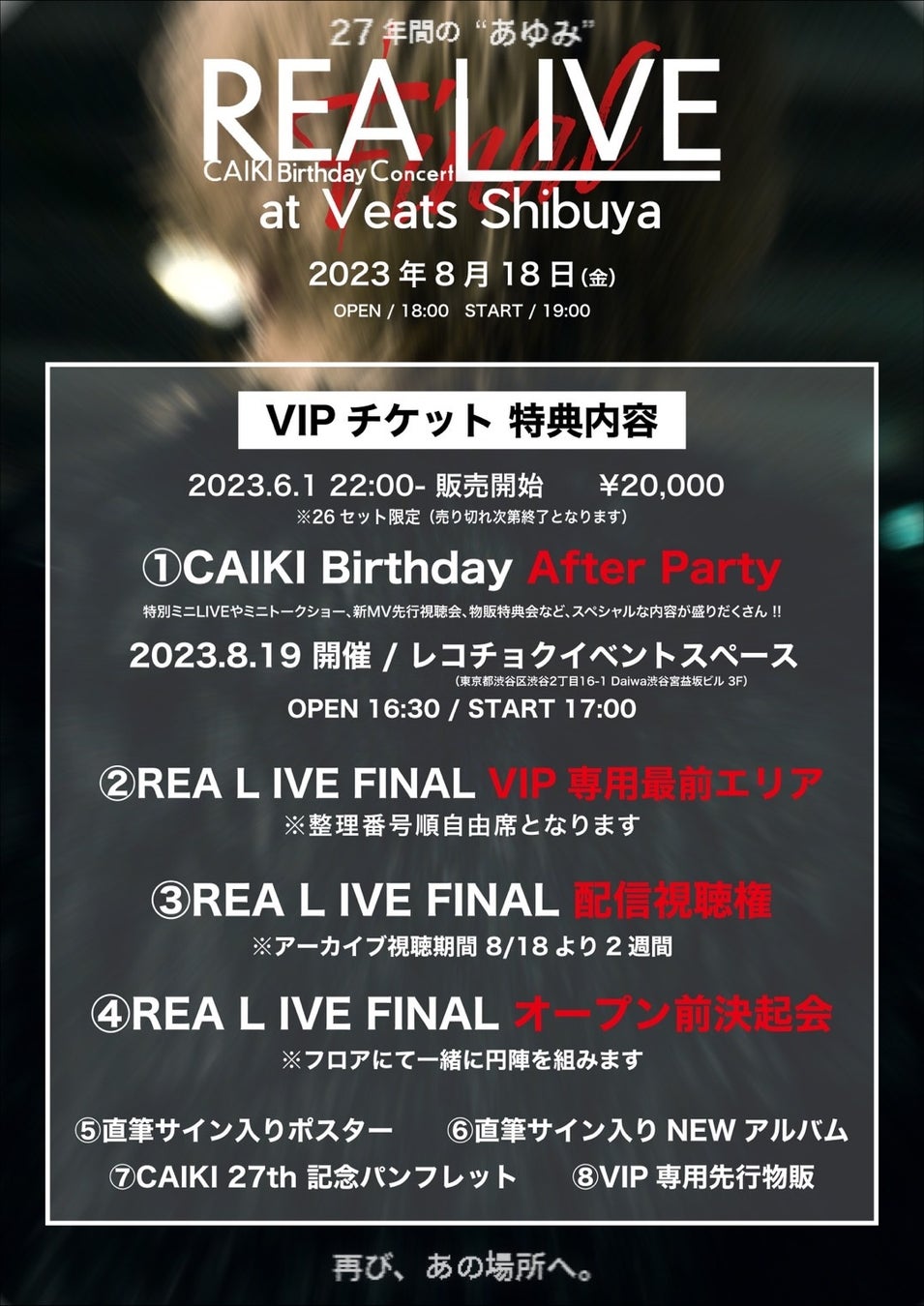 6月1日(木)22:00販売開始:VIPチケット:20,000円(税込) ※26席
