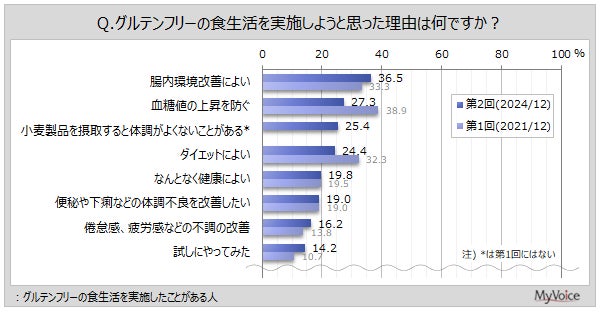 グルテンフリー生活の実施経験者では「腸内環境改善によい」「血糖値の上昇を防ぐ」「ダイエットによい」が、グルテンフリー生活を実施したくないと回答した人では「好きなものが食べられない」「ストレスがたまる」「グルテンフリーの食品を確認・準備するのが大変」が上位となっています。