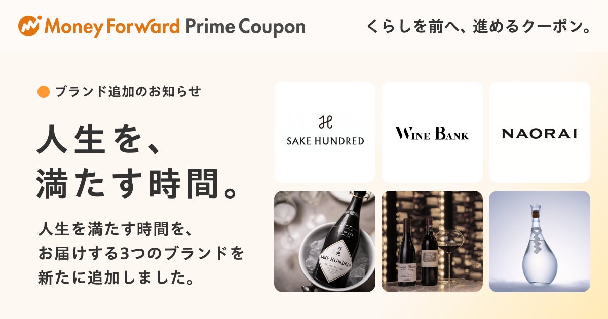 マネーフォワードホーム株式会社は、お金の見える化サービス『マネーフォワード ME』プレミアム会員限定「Prime Coupon(プライムクーポン)」の第八弾として、本日2025年12月16日(火)より新たなクーポンを提供開始します。第八弾は「人生を、満たす時間。」をテーマに、最高峰の日本酒づくりを目指し提供している株式会社Clear、高級ワインの老舗インポーターである株式会社WineBank、第三の和酒「浄酎-JOCHU-」を提供しているナオライ株式会社の3社を新たにパートナー企業として迎えました。