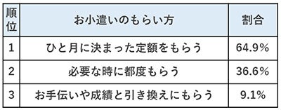 全国のお小遣いをもらっている高校生1,000人にお小遣いについて聞いたところ、1ヶ月にもらう平均金額は「5,582円」という結果に。また、学年が上がるごとに金額も比例していくイメージですが、実際は高校3年間で平均金額が14.9%上がっていることも分かりました。もらい方については、1か月に決まった金額を定額でもらう人は64.9%、必要な時に都度もらう人は36.6%、お手伝いや成績が良かったことと引き換えにもらっている人は9.1%でした。