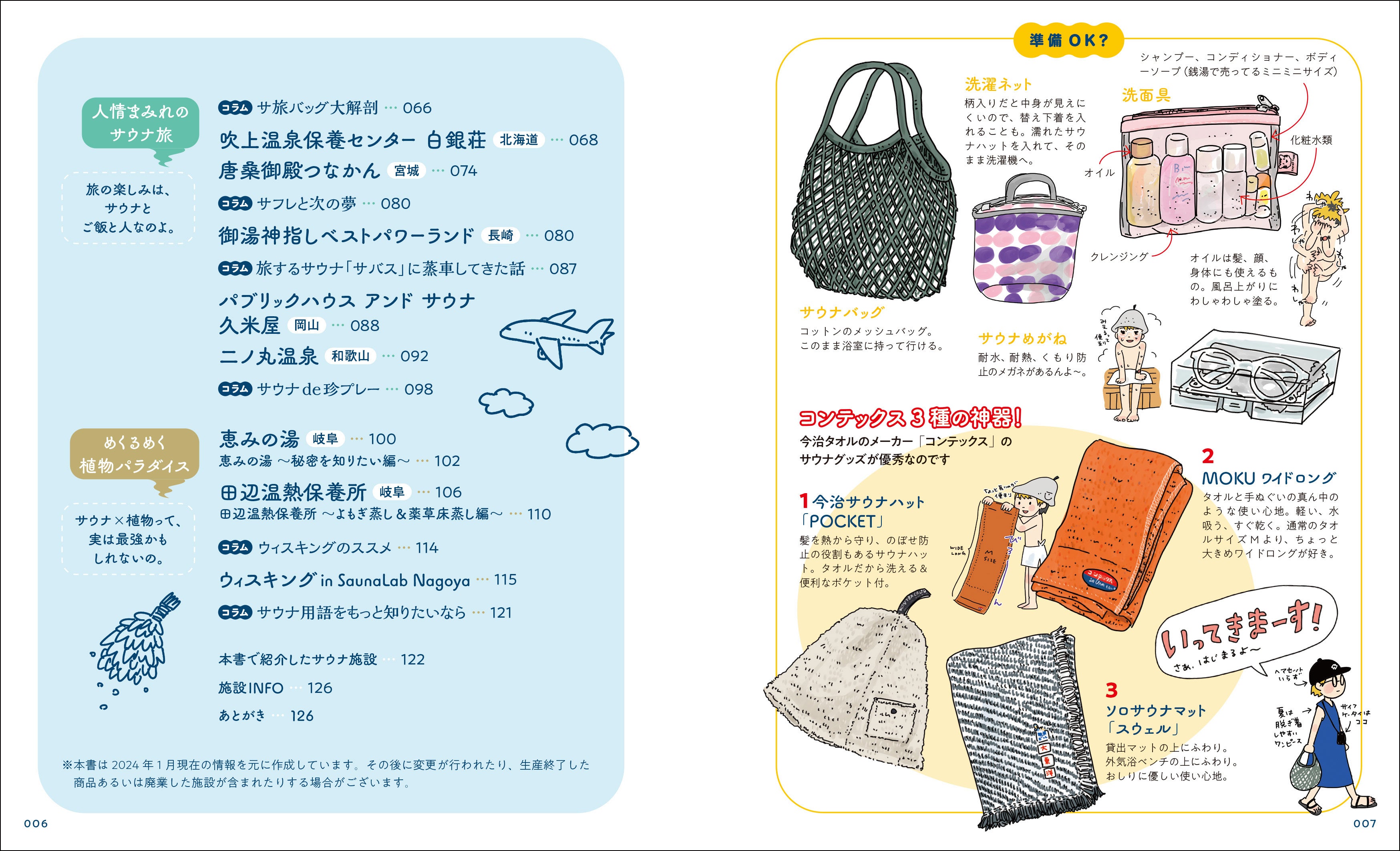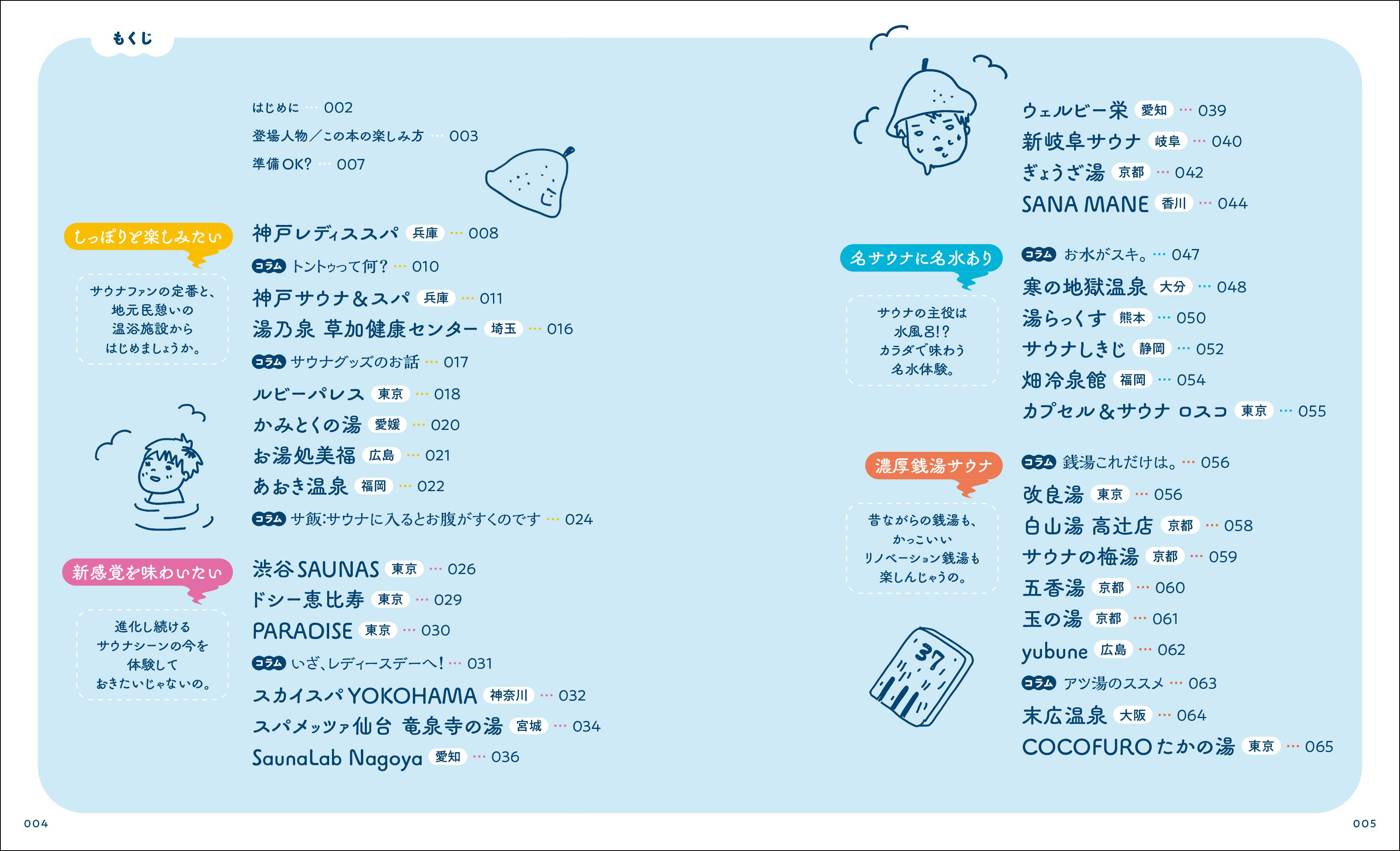 絵日記のように描きためたサ活イラストには、サウナをより深く味わうための偏愛エッセンスがぎゅっと詰め込まれています。厳選された37施設を紹介するだけでなく、「サ旅バッグ大解剖」「サウナde珍プレー」などのコラムも充実。