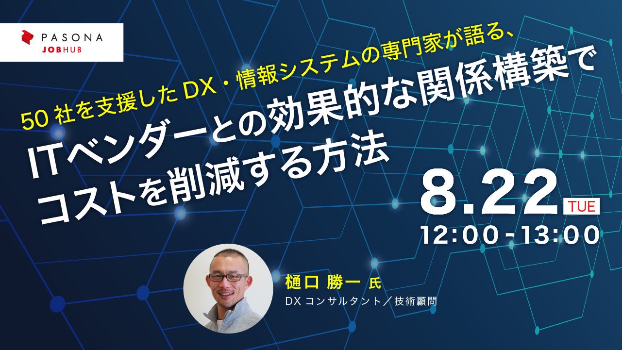 パソナJOB HUB主催ウェビナー 8月22日開催『50社を支援したDX・情報システムの専門家が語る、ITベンダーとの効果的な関係構築でコストを削減する方法』