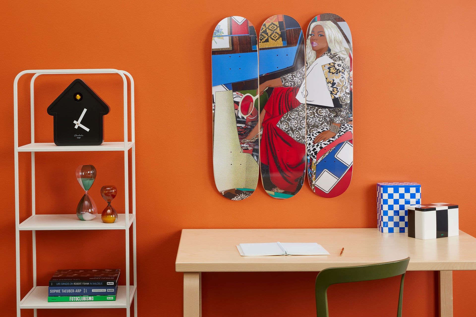 ミカリーン・トーマスの作品『Din Avec La Main Dans Le Miroir Et Jupe Rouge』(2023年)が再現されたスケートボード三連作。同作品は、豪華な織物を身にまとい、グラマラスな髪型とメイクで飾られた誇り高いヒロインのポートレートを描いたものです。