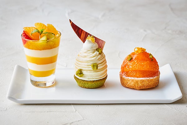 1月~2月の「Seasonal Dessert Set」は、みかん、柚子、オレンジのデザート3種をご用意いたします。みかんクーリとホワイトチョコレートムースを交互に重ね、みかんゼリーの上にフレッシュみかんやフルーツを飾った“みかんのヴェリーヌ(左)”、抹茶ビスキーの上に苺ムースと柚子のクーリをのせ、柚子の香りが広がる上品な味わいのクリームをまとった“柚子のモンブラン(中央)”、ピスタチオクリーム入りのタルトに爽やかなオレンジ風味のカスタードクリームをのせ、酸味と甘みのバランスが良いザクロのシロップに漬け込んだフレッシュオレンジを贅沢に飾った“オレンジのタルト(右)”を、コーヒーまたは紅茶とともにご堪能ください。