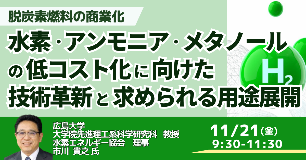 JPI(日本計画研究所)は、広島大学 大学院先進理工系科学研究科 教授 水素エネルギー協会 理事 市川 貴之 氏を招聘し、水素・アンモニア・メタノールの低コスト化に向けた技術革新と求められる用途展開について詳説いただくセミナーを開催します。