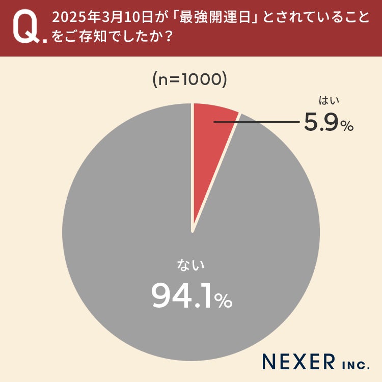 5.9%の方が、2025年3月10日が「最強開運日」とされていることを「知っている」と回答しています。