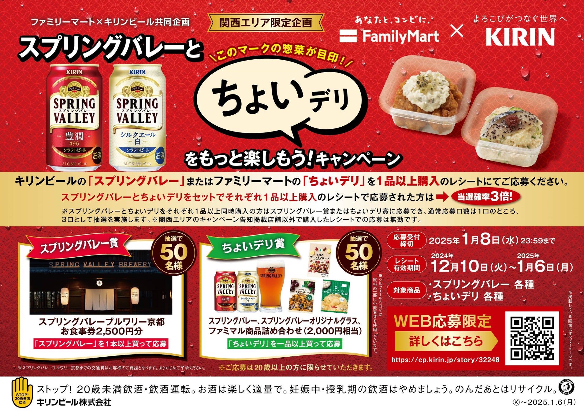 期間中に「スプリングバレー」または「ちょいデリ」をご購入いただくと、スプリングバレー賞「スプリングバレーブルワリー京都お食事券2,500円分」もしくはちょいデリ賞「スプリングバレー、スプリングバレーオリジナルグラス、ファミマル商品詰め合わせ(2,000円相当)」に応募できるキャンペーン(※)を実施いたします。