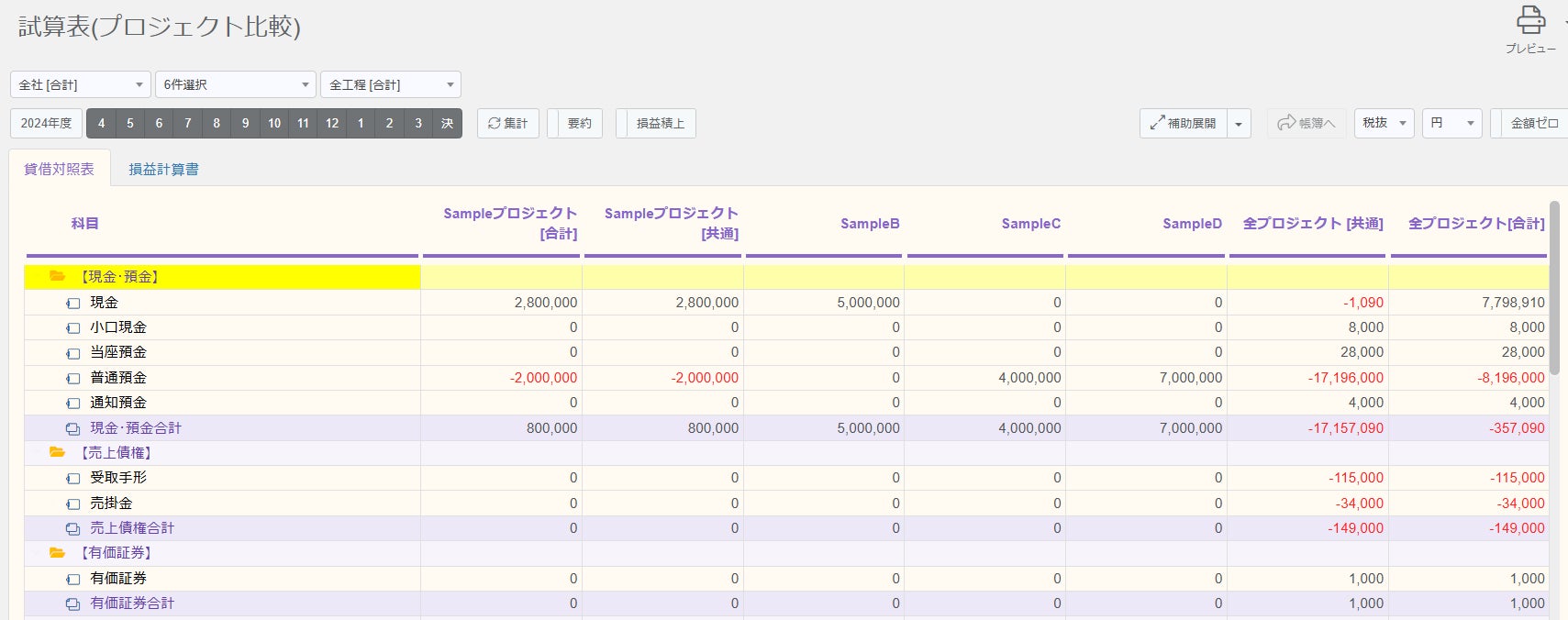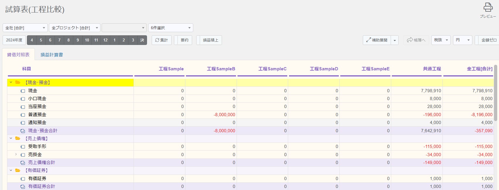 上記の他に既存で利用可能な下記の試算表においても、プロジェクトと工程による集計・比較が可能です。