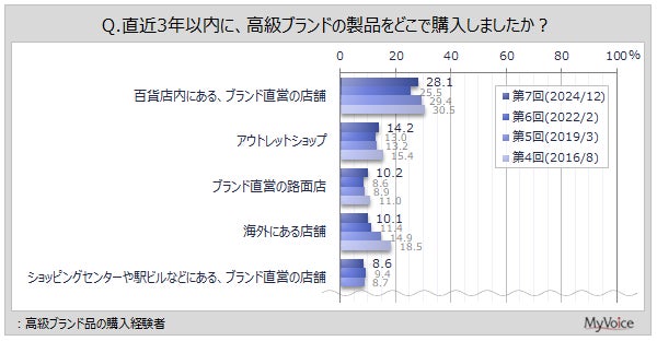 高級ブランド品の購入経験者が、直近3年以内に購入した場所は(複数回答)、「百貨店内にある、ブランド直営の店舗」が28.1%、「アウトレットショップ」「ブランド直営の路面店」「海外にある店舗」が各10%台です。