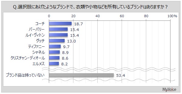 所有している製品のブランドは(複数回答)、「コーチ」「バーバリー」「ルイ・ヴィトン」「グッチ」が各10%台で上位にあがっています。