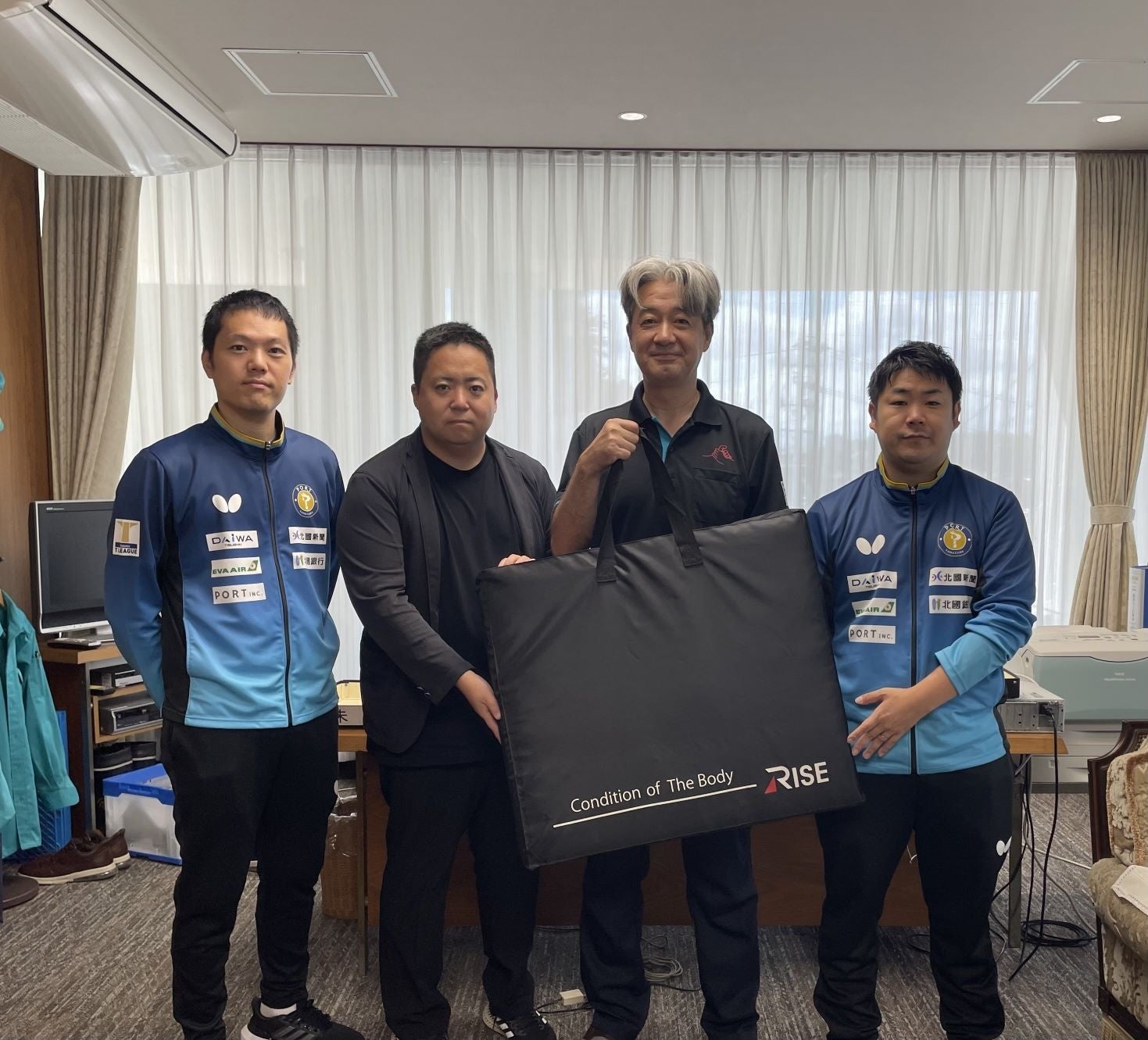 Tリーグでは、健康睡眠パートナーのライズTOKYO株式会社(本社:東京都港区 代表取締役社社長 宮崎 誠司、ブランド名「RISE(ライズ))の協力を得て、高反発マットレスパッド100枚を、令和6年能登半島沖地震で被災された石川県穴水町に寄贈いたしました。 寄贈にあたっては、石川県に本拠地を置く、金沢ポートの西東輝 代表取締役が穴水町を訪問。高反発マットレスパッド100枚を吉村光輝町長に手渡しいたしました。