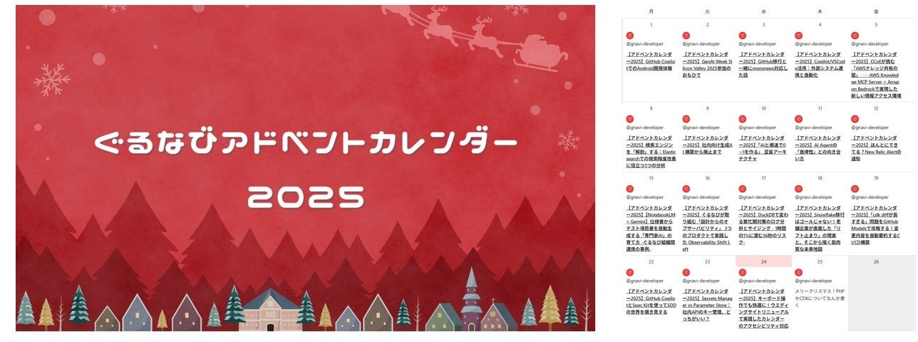 株式会社ぐるなび(本社:東京都千代田区、代表取締役社長:杉原章郎、以下ぐるなび)は、開発部において「ぐるなびアドベントカレンダー2025」を実施し、2025年12月1日(月)から12月25日(木)までの期間中、全26本の技術記事を公開しました。 本年度は特に「生成AIによる業務効率化」や、「社内ナレッジの民主化」をテーマに、Geminiなどの最新の生成AIを実務に導入した具体的な成果を多数発信しています。