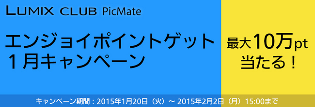 パナソニック株式会社は、無料クラウド写真サービス「LUMIX CLUB PicMate」において、2015年1月20日(火)~2015年2月2日(月)、「最大10万ptが当たる!エンジョイポイントゲット1月キャンペーン」を実施しています。