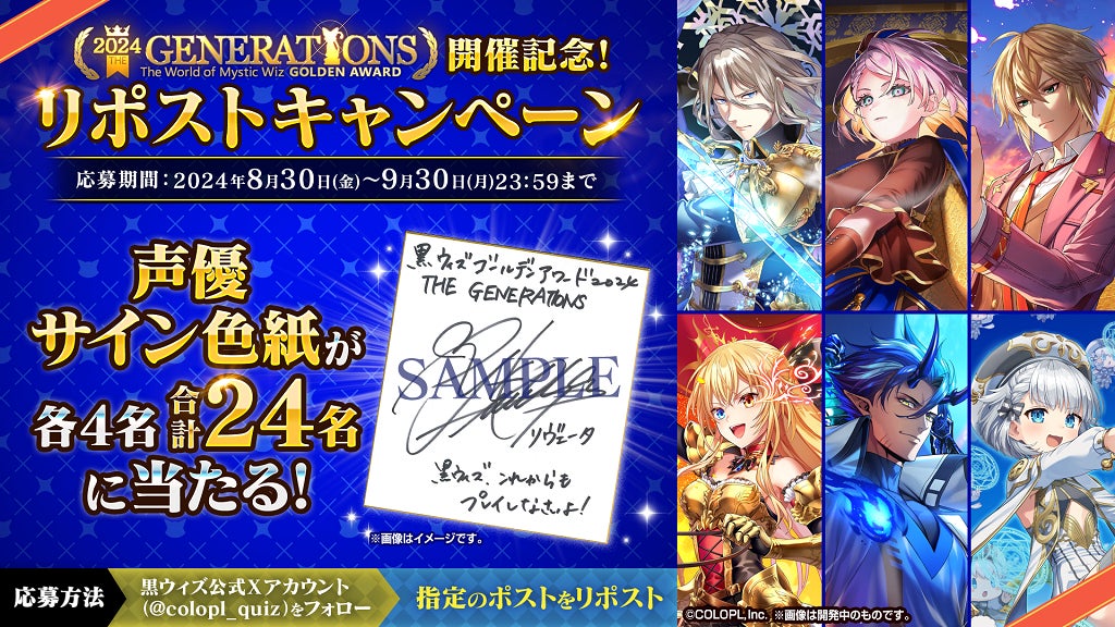 株式会社コロプラ(代表取締役社長:宮本貴志、本社:東京都港区、以下『コロプラ』)は、スマートフォン向けゲーム『クイズRPG 魔法使いと黒猫のウィズ(以下、『黒猫のウィズ』)』にて、2024年8月30日(金)よりユーザー人気投票で選ばれた精霊が登場する「ゴールデンアワード 2024 THE GENERATIONS」を開催しております。