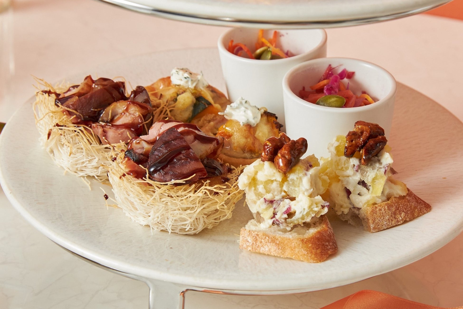 また下段には、秋の食材を存分に使用したキッシュやカナッペ、紫キャベツとバターナッツカボチャのラぺ、細い麺状生地のカダイフを鳥の巣に見立てた器に合鴨と栗を添え、バルサミコソースを使用しました。