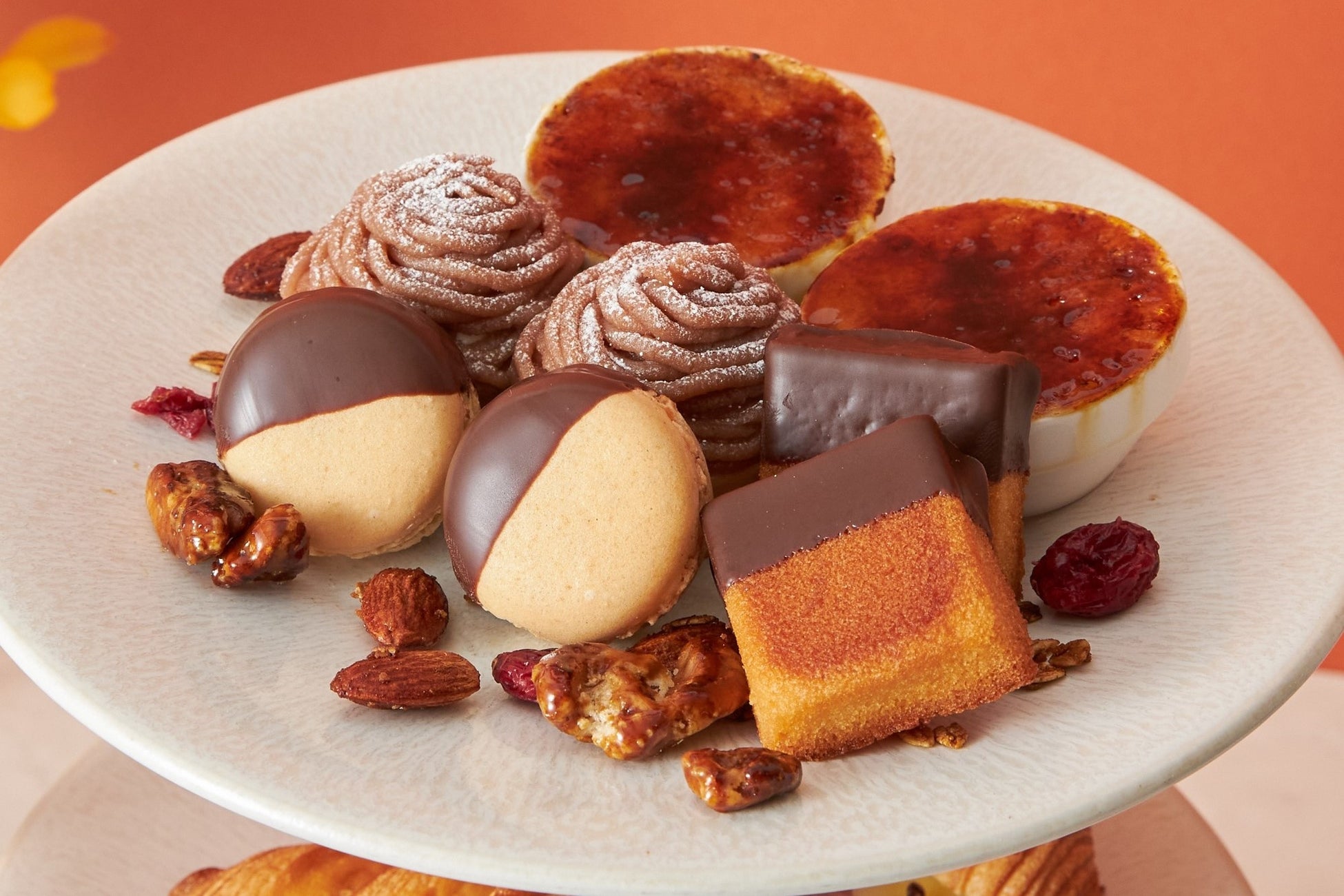 上段にはプチモンブラン、チョコをコーティングしたマカロンのほか、クッキーやフィナンシェなどの焼き菓子やスイートポテトをブリュレ仕立てにしてご用意しました。