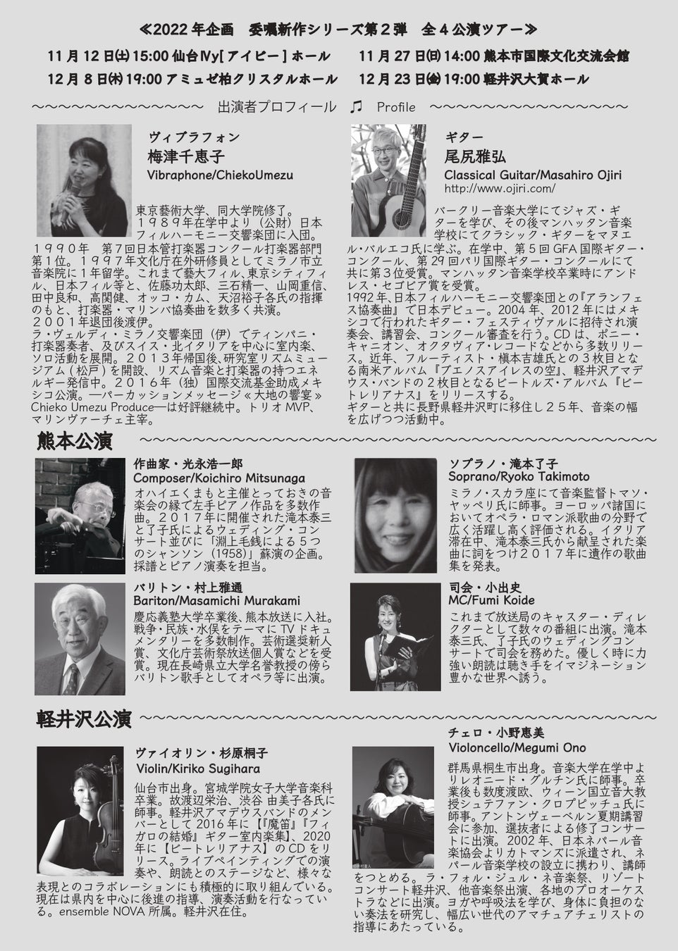 熊本公演では、熊本ゆかりの作曲家滝本作品から「愛の力」、水俣の詩人毛銭の「シャンソン」ほか、熊本の現代作曲家光永浩一郎による冴えた企画で、地元の方々との意欲的コラボレーションが見どころ!