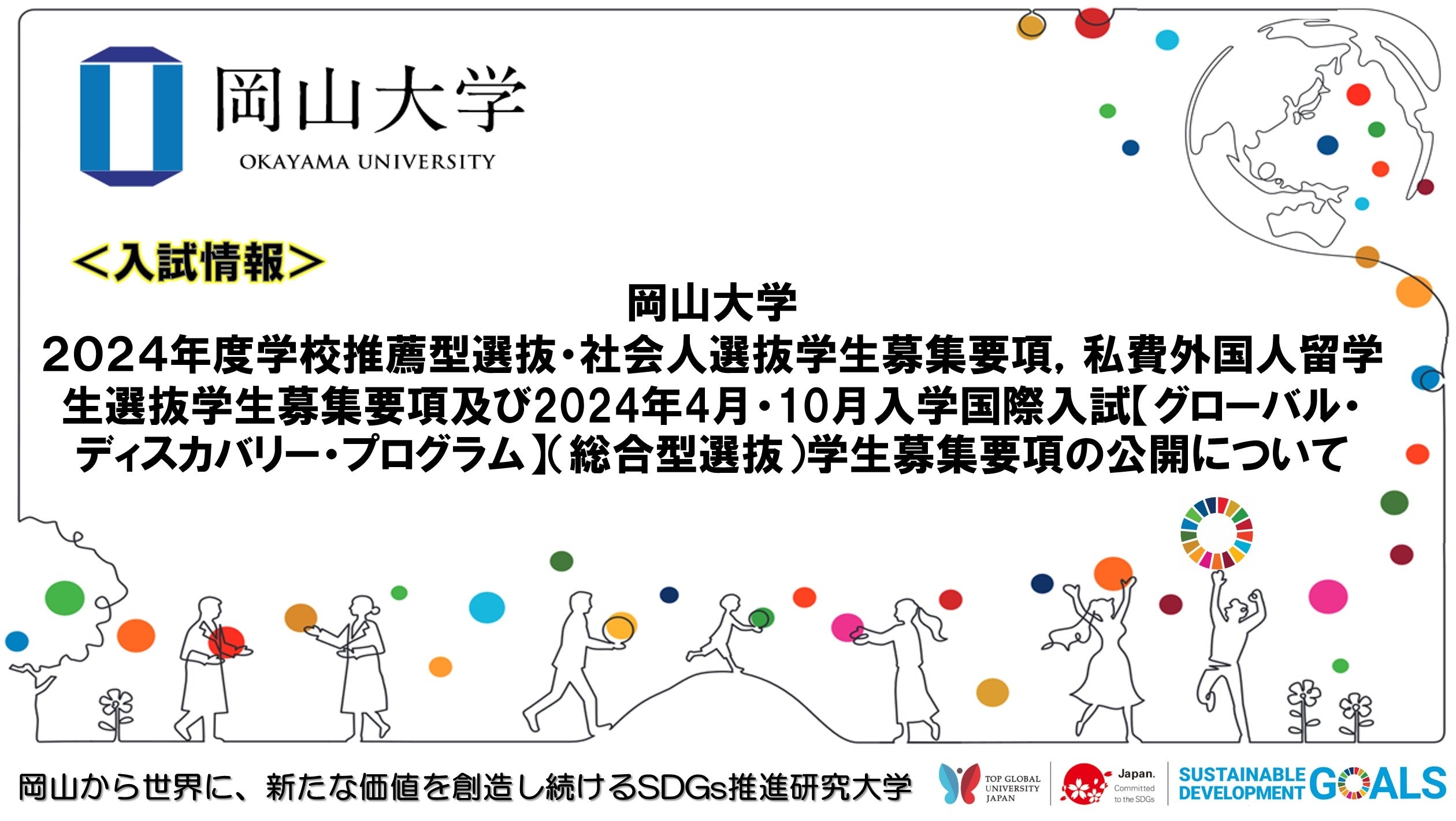 【岡山大学】2024年度学校推薦型選抜・社会人選抜学生募集要項,私費外国人留学生選抜学生募集要項及び2024年4月・10月入学国際入試【GDP】(総合型選抜)学生募集要項の公開について
